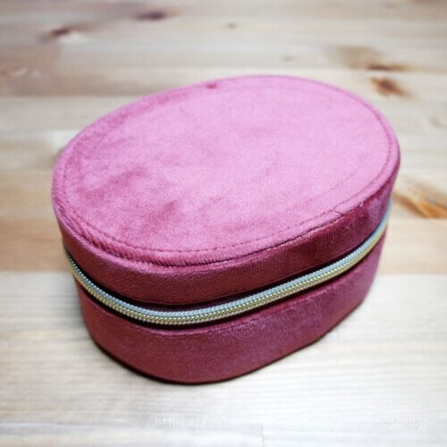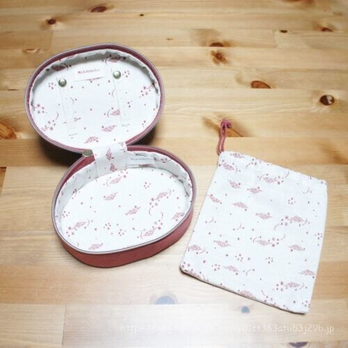 ジュエリーコフレはフタの裏に付いている紐の部分にリングを通したりピアスを止めたりできて、巾着と一緒に使うと細々したものもきれいに収納できそうです。