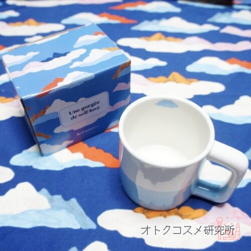 マグカップは水色のやさしい色合いで、内側に雲のワンポイント、底面には文字が描かれています。