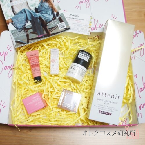アテニアのクレンジングオイルと&beのパウダーがすべてのボックスに入っていて、エクセルから1アイテム、ヴィセのリップがどれか1色、残り1つがランダムセレクト、そしてプラスワンでアヴェダでした。